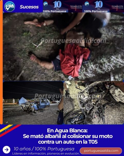 (Miguel Enrique Villavicencio).- Una violenta colisión entre un auto y una moto, caso que ocurrió la noche de este domingo 15 de febrero en la Troncal 05, a la altura del sector Caramacate, jurisdicción del municipio Agua Blanca, causó el deceso de una persona, mientras que otra resultó herida. La