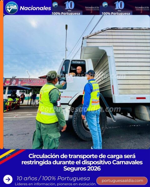 Autoridades velarán por el cumplimiento a la restricción de vehículos del transporte de cargas El Instituto Nacional de Transporte Terrestre (INTT), informa a los operadores de transporte de carga que su circulación estará restringida desde este domingo 15 de febrero de 2026 a la 1:00 a. m., hasta el miércoles
