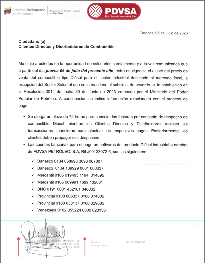El Ministerio de Energía y Petróleo a través de la estatal petrolera venezolana PDVSA, emitió un comunicado la tarde de este 5 de Julio anunciando un incremento del precio del diesel para el sector industrial.