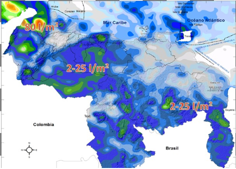 Esta onda va desplazándose sobre el occidente del país, complementando la actividad de la Zona de Convergencia Intertropical; y son además reforzadas, por Divergencia del viento en la alta troposfera; probables, acumulados pluviométricos entre 2-20 l/m², con máximos hasta 35 l/m² en Guárico, Anzoátegui, Bolívar y Amazonas.