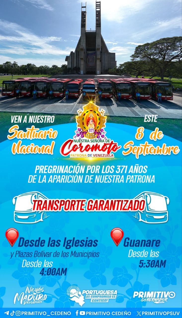 Desde este 8 y hasta el próximo 11 de septiembre, 350 unidades de transporte público y privado movilizarán a los feligreses hasta el Santuario Nacional Basílica Menor para la celebración de los 371 años de la aparición de la Virgen de Coromoto.