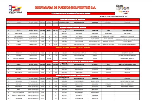 El buque AGIA MARINA, trajo 32.150 toneladas de maíz amarillo descargado ayer 18 de septiembre, el pasado 13 septiembre el buque BLACKY, trajo 29.598,30 toneladas mas y el buque CHICAGO HARMONY, atracó el 17/09/2023 con 32.998 toneladas más, según un informe Bolivariana de Puertos, para un total de 94 millones de kilos de maíz amarillo para la industria nacional.