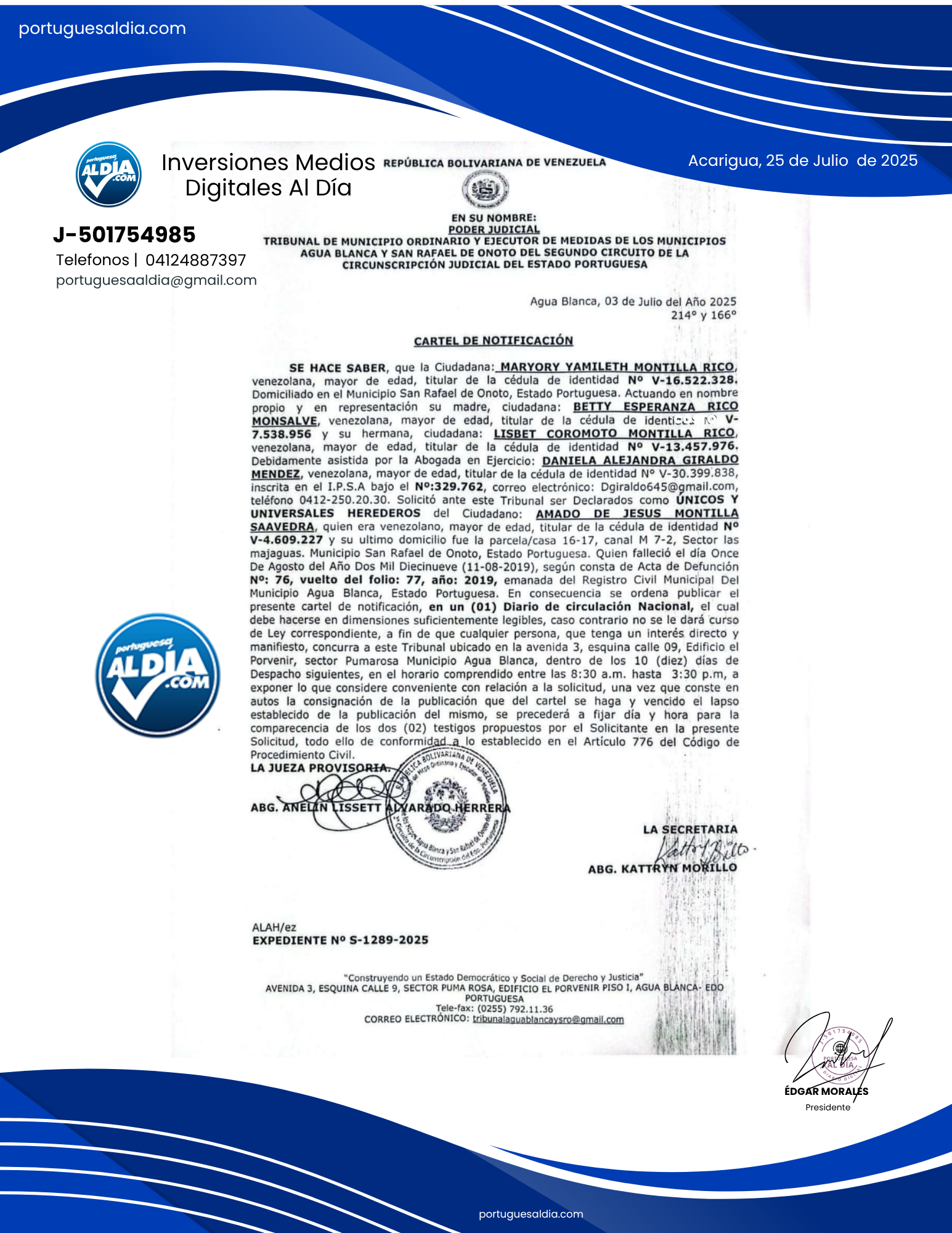 Actualidad Publicidad Cartel de Notificación: SE HACE SABER, que la Ciudadana: MARYORY YAMILETH MONTILLA RICO 07/23/2025 Edgar Morales No hay comentarios