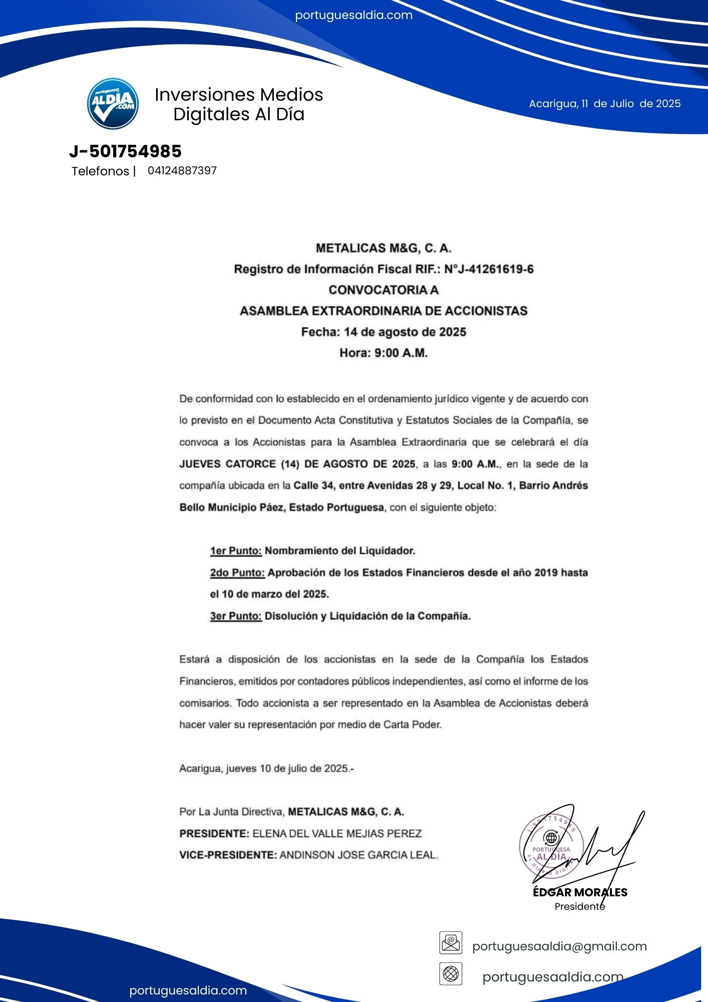 Actualidad Publicidad Cartel de Notificación | METALICAS M&G, C. A. | Asamblea Extraordinaria 07/11/2025 Edgar Morales No hay comentarios