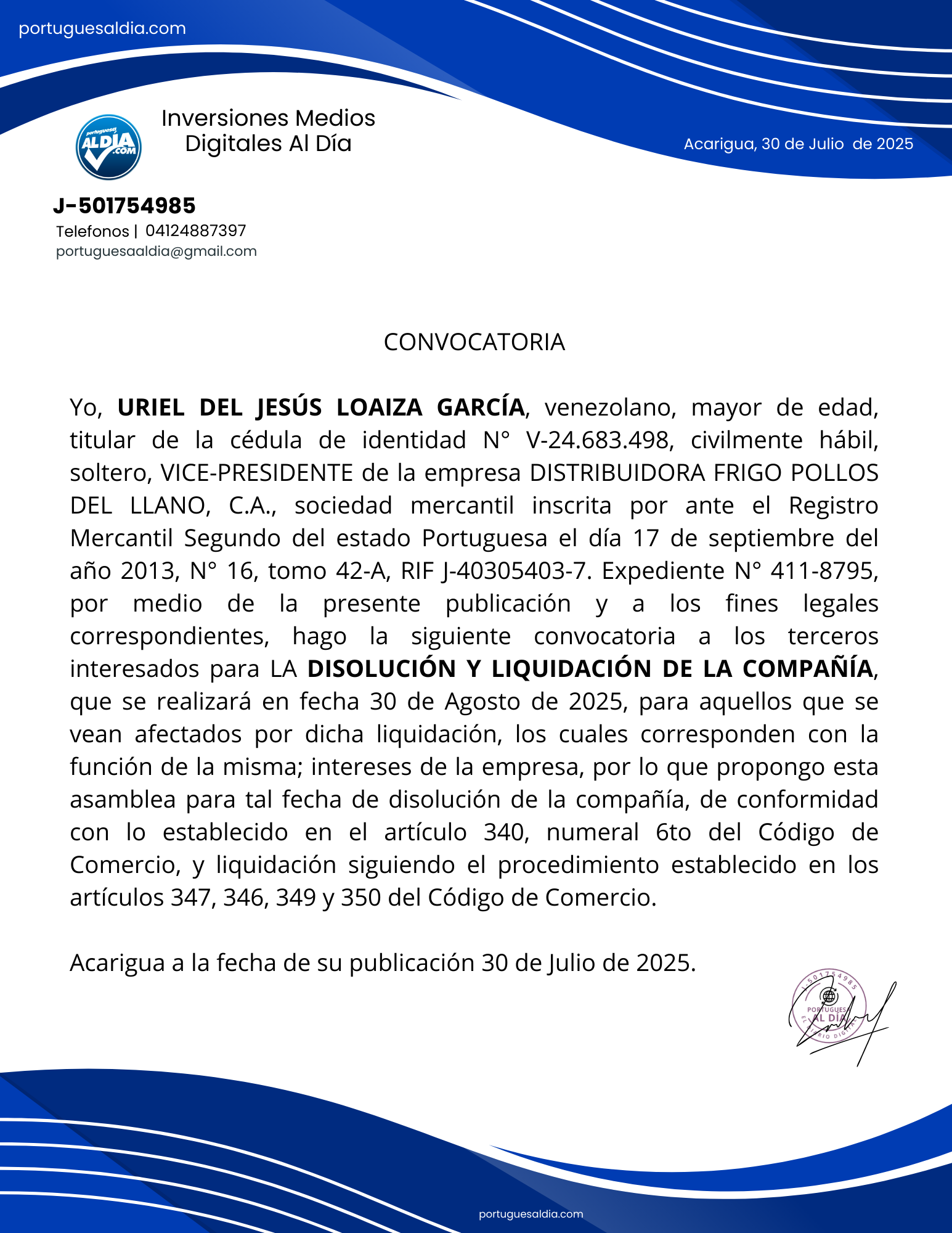 Actualidad Publicidad CONVOCATORIA: DISTRIBUIDORA FRIGO POLLOS DEL LLANO II, C.A., 07/30/2025 Edgar Morales No hay comentarios