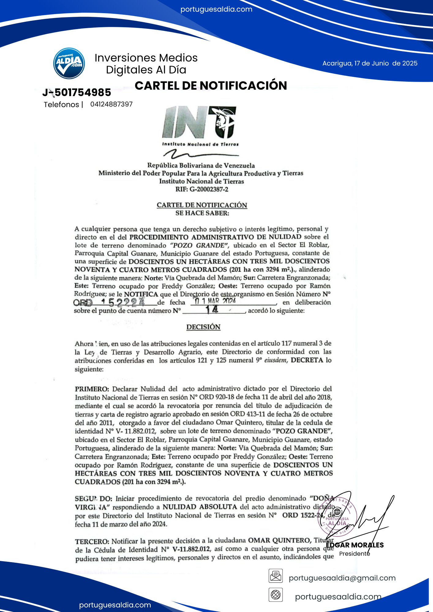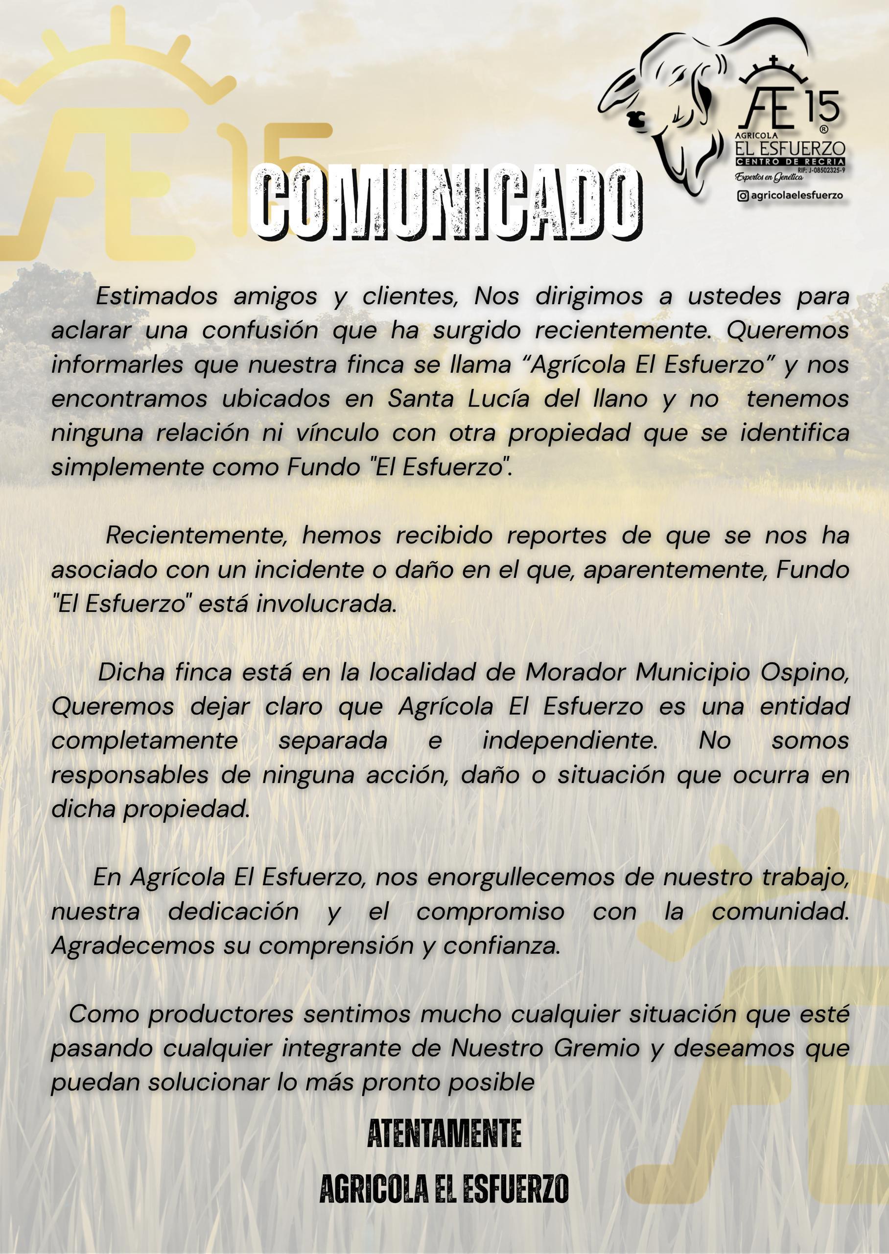 COMUNICADO A LA OPINION PÚBLICA | AGRÍCOLA EL ESFUERZO Estimados amigos y clientes, Nos dirigimos a ustedes para aclarar una confusión que ha surgido recientemente. Queremos informarles que nuestra finca…