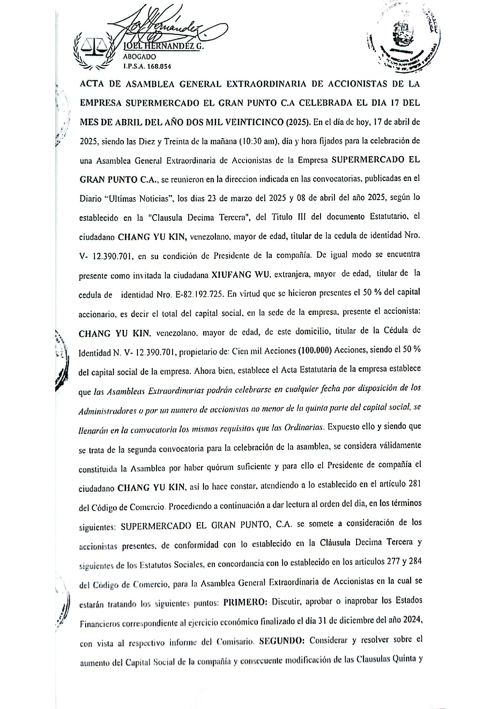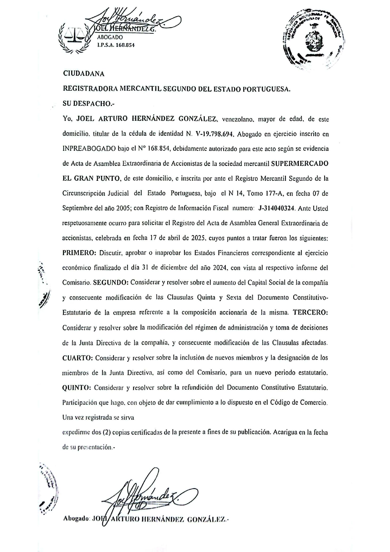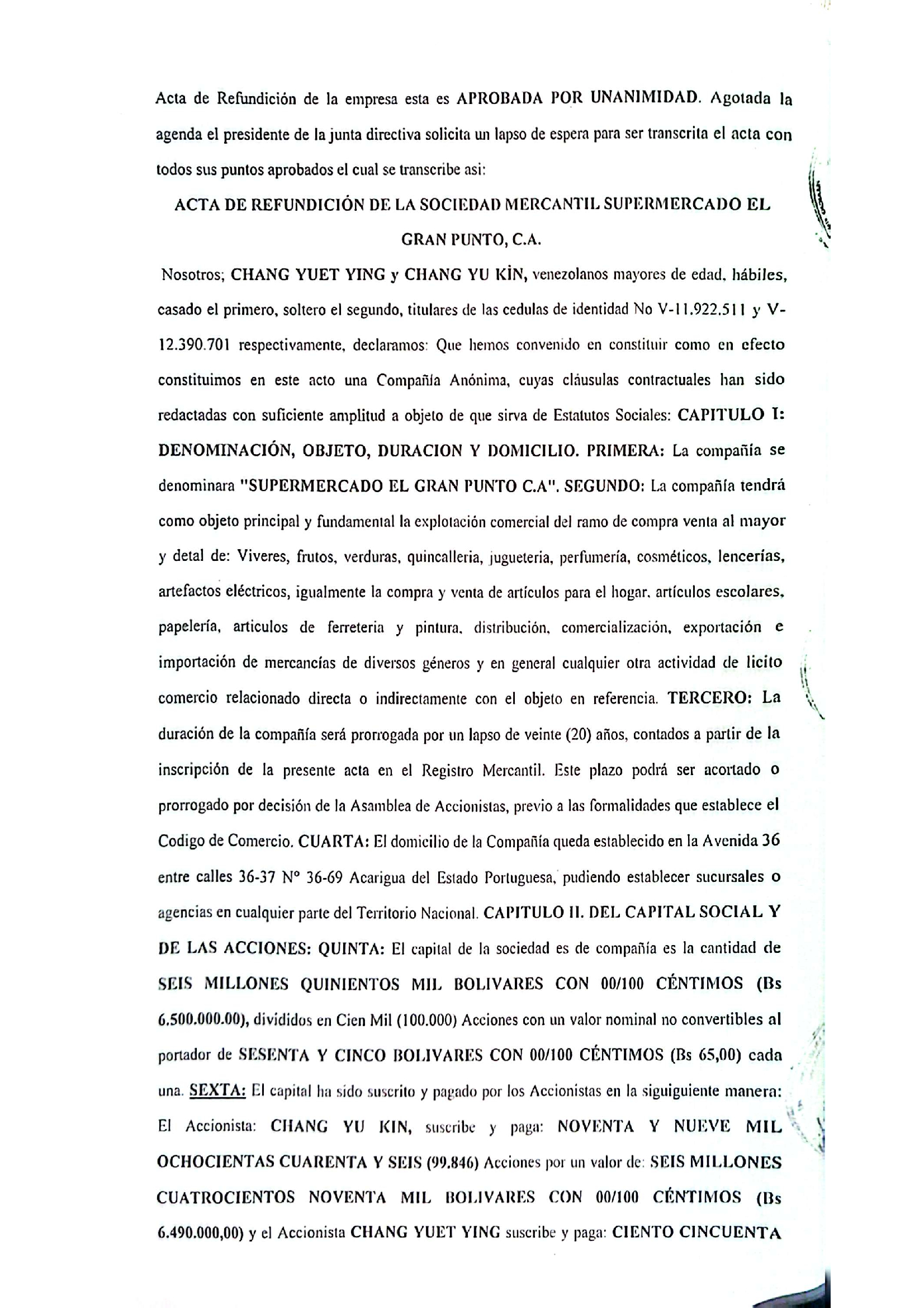 AUMENTO DE CAPITAL DE EMPRESA MERCANTIL, SUPERMERCADO EL GRAN PUNTO C.A.
