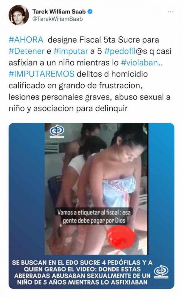 “El adelanto de nuestras investigaciones en tiempo real determina preliminarmente que estos cinco aberrados sexuales que intentaron matar a un niño de cinco años han sido ubicados en el estado Lara. El MP solicitará pena máxima de 30 años de cárcel”, detalló el fiscal.