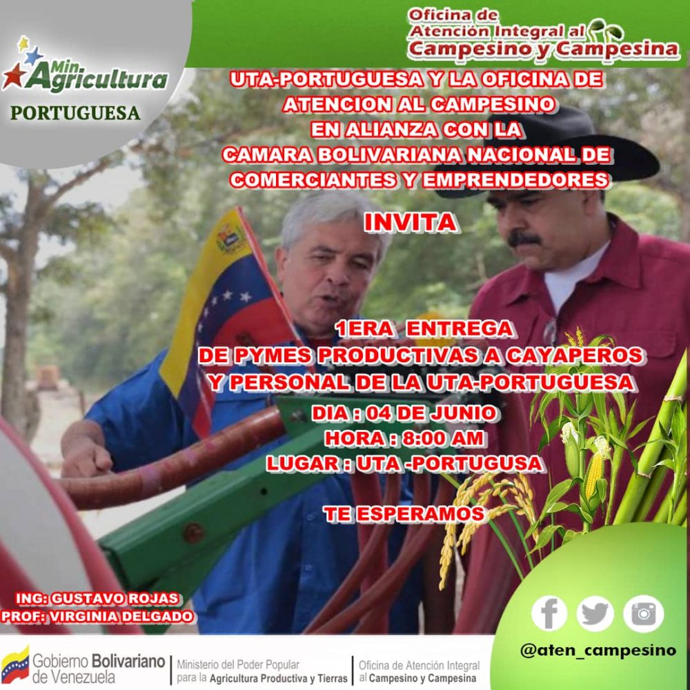 La Cámara Nacional Bolivariana de Comerciantes y Emprendedores del estado Portuguesa, invitó a toda la colectividad a una gran feria cayapa campesina que se va a estar llevando a cabo el día sábado 4 de junio en las instalaciones del Ministerio Agricultura y Tierra, actividad en alianza con la Unidad Territorial Agrícola del Ministerio de Agricultura y que dirige Virginia Delgado, el director Gustavo Rojas en alianza con la cámara nacional bolivariana de comerciantes y emprendedores del estado Portuguesa que dirige Franklin Pérez.