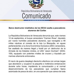 El hecho ocurrió el viernes 12 de septiembre y fue calificado por el gobierno venezolano como una «grotesca y desmedida provocación». El destructor, equipado con misiles de crucero y tripulado por marines altamente entrenados, desplegó 18 efectivos armados que abordaron la embarcación durante ocho horas, impidiendo la comunicación de los pescadores y paralizando sus labores.