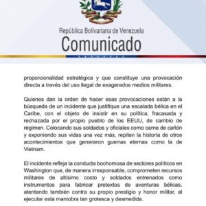 El comunicado oficial exige a Estados Unidos el cese inmediato de este tipo de maniobras, que, según el gobierno venezolano, buscan provocar un incidente armado en el Caribe bajo una operación de falsa bandera. Asimismo, hicieron un llamado al pueblo estadounidense para que reconozca la peligrosidad de estas acciones ordenadas por su gobierno.