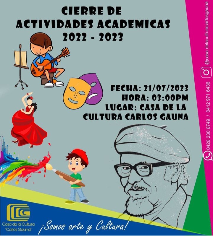 El próximo 21 de julio a las 3:00 de la tarde, la dirección de la casa de la cultura Carlos Gauna, realizará el cierre de actividades académicas 2022-2023 con una muestra cultural y entrega de certificados a sus estudiantes.