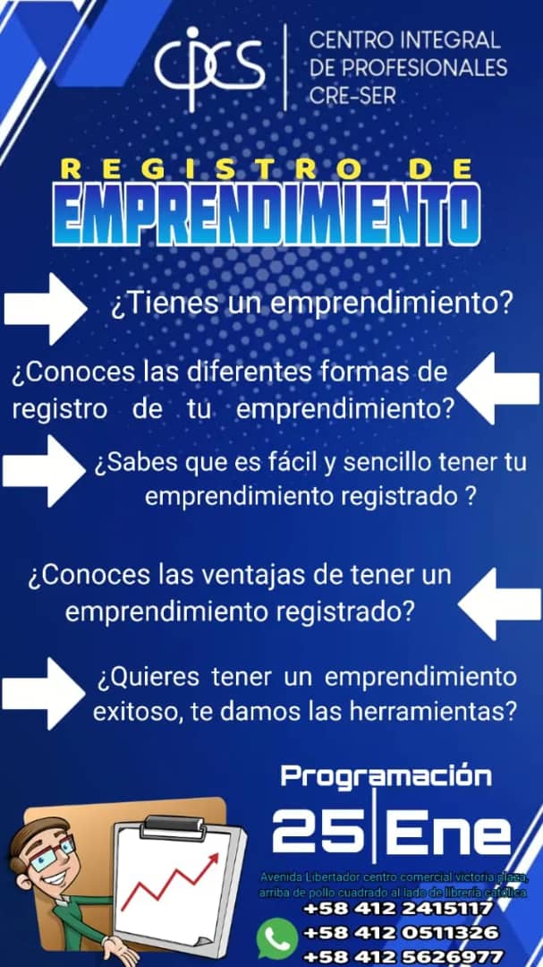 El Centro Integral de Profesionales Cre-Ser se complace en invitarte a participar en el próximo Taller de Registro de Emprendimiento. Durante este evento, aprenderás las diferentes formas de registro de tu emprendimiento y descubrirás lo fácil y sencillo que es tener un emprendimiento registrado. Además, conocerás las ventajas de tener tu negocio formalizado y obtendrás las herramientas necesarias para alcanzar el éxito.
