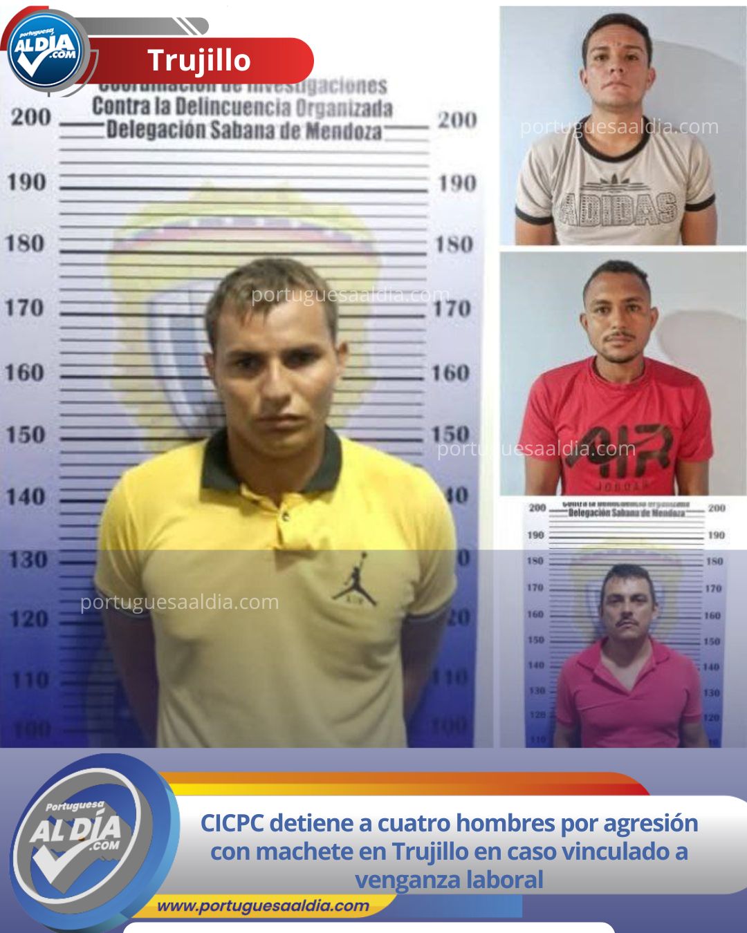 PortuguesaAldia.com – Funcionarios del Cuerpo de Investigaciones Científicas, Penales y Criminalísticas (CICPC) apprehended a cuatro hombres señalados de agredir con un machete a un ciudadano de 55 años en la parroquia Cheregue del estado Trujillo. El hecho, ocurrido presuntamente por venganza, evidenció un conflicto laboral escalado a la violencia física.
