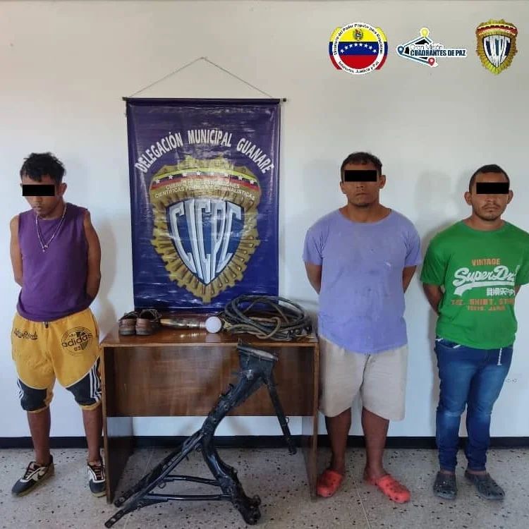 Los detenidos quedaron identificados como Eduardo José Díaz Mena, de 25 años de edad, Victor Manuel Gómez Dun de 27 años de edad y su hermano José Ramón Gómez Dun de 35 años de edad, a quienes se les encontró en su poder un chasis de moto marca Bera, modelo BR-150, placas AB5152, que estaba siendo solicitado por sustracción por el Eje de Vehículos del estado Portuguesa.