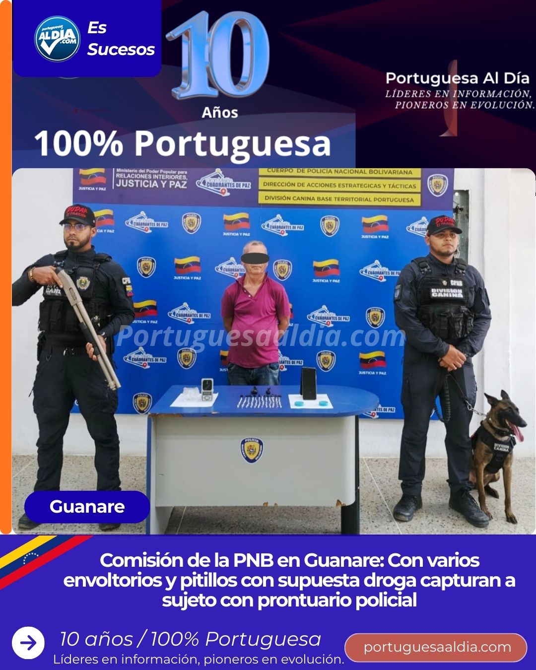 (Miguel Enrique Villavicencio).- Mediante un previo trabajo de inteligencia social, funcionarios de la División Canina del Cuerpo de la Policía Nacional Bolivariana, lograron capturar a un sujeto que presuntamente se dedica a la venta y distribución de drogas en Guanare.