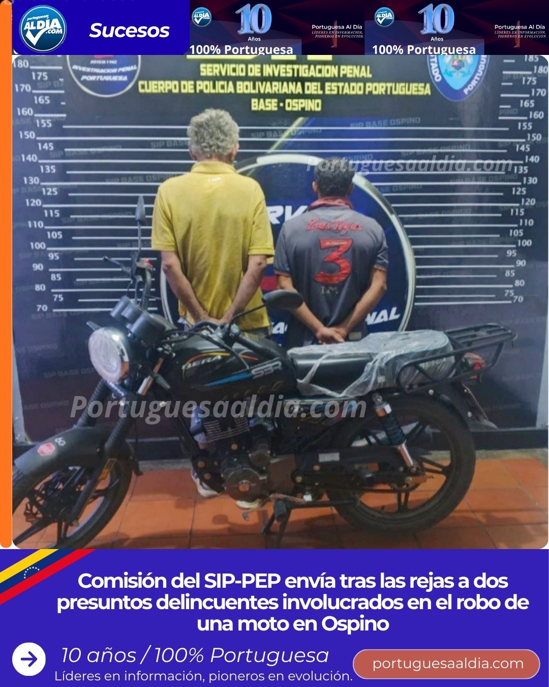 (Miguel Enrique Villavicencio).- Dos sujetos supuestamente involucrados en el robo de una moto, fueron capturados por funcionarios del Servicio de Investigación Penal de la Policía del estado Portuguesa (SIP-PEP), durante un operativo de seguridad llevado a cabo en la población de Ospino.