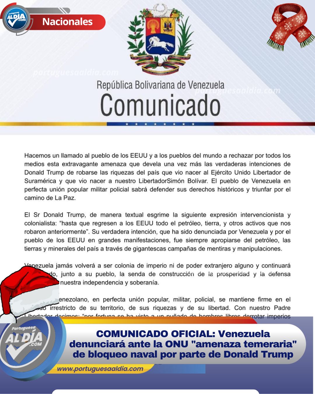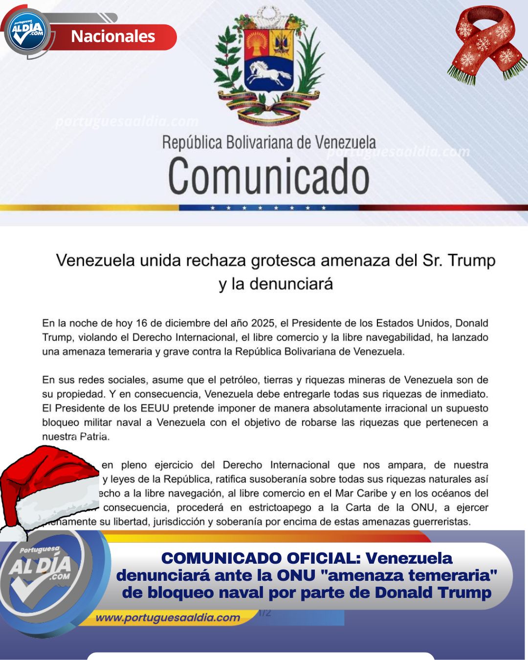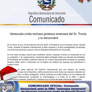 En la noche de este martes 16 de diciembre de 2025, la República Bolivariana de Venezuela emitió un comunicado oficial en rechazo a las recientes declaraciones del presidente de los Estados Unidos, Donald Trump. El Ejecutivo Nacional calificó como «grotesca y temeraria» la amenaza de imponer un bloqueo militar naval, acción que consideran una violación flagrante al Derecho Internacional, al libre comercio y a la libre navegabilidad.