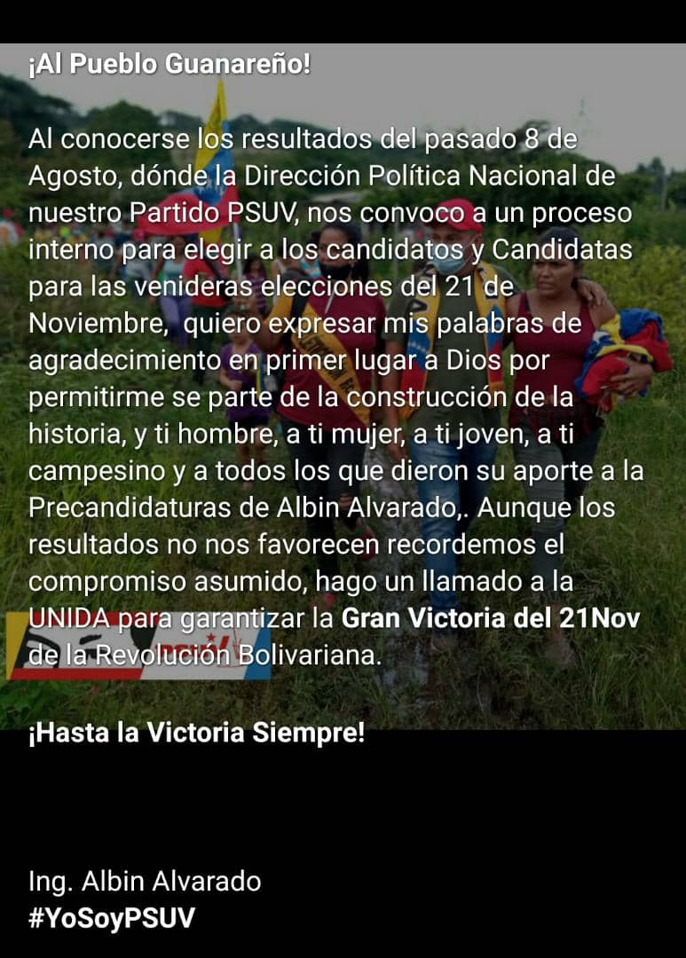 Alvarado, quien participó como precandidato en las elecciones internas del Psuv, dijo sentirse agradecido del apoyo recibido y aunque no logró ganar esta presto a trabajar para mantener la alcaldía en manos de la revolución.