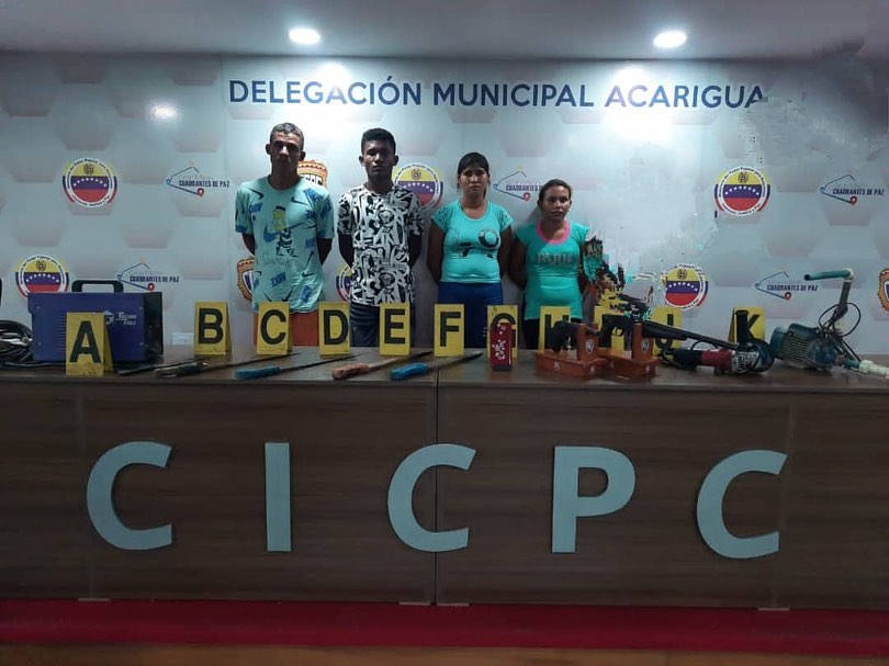 Enmarcados en la Gran Misión Cuadrantes de Paz, funcionarios de la Delegación Municipal Acarigua adscritos a la Brigada Contra Robos, detuvieron a Wilmer Antonio Pérez (48 años), Adelaida Andreina Escorcha Cesar (23 años), Raúl Lucidio Peña Parada, (24 años) Francis Yamile Palmera Guedez, de (18 años) y un adolescente de 17 años en el Barrio La Victoria, Parroquia Payara, Municipio Páez del estado Portuguesa, luego de comprobarse mediante investigaciones de Campo y Criminalística su participación en el Robo de varios objetos, los cuales se encuentran inmerso en la investigación.