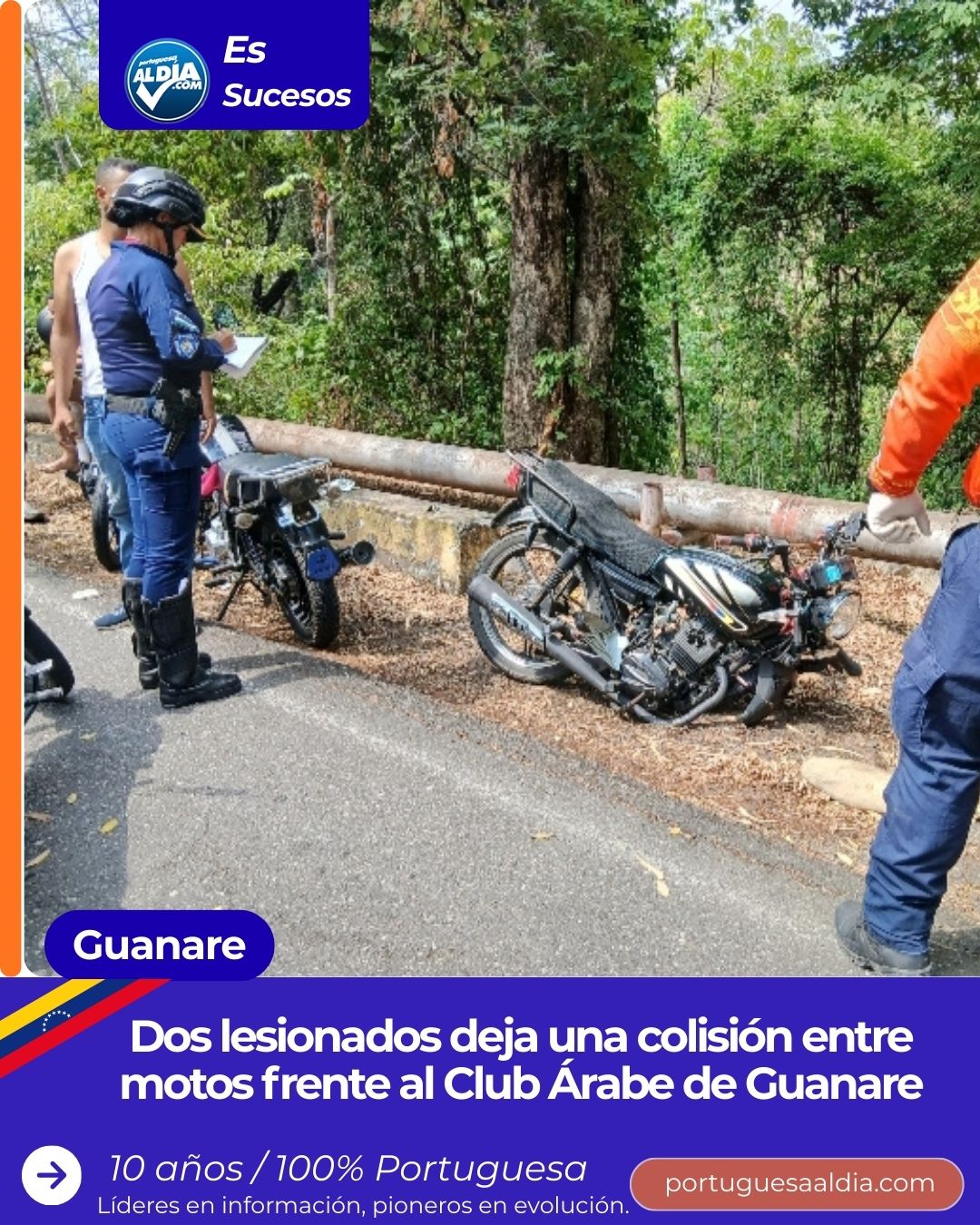 (Miguel Enrique Villavicencio).- Dos personas resultaron heridas durante una colisión entre motos que se produjo a primeras horas de la tarde de este miércoles 7 de enero en la carretera nacional Guanare – Biscucuy, a la altura del Club Árabe.
