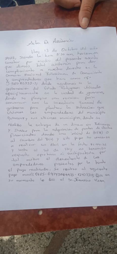 Hoy 13 de octubre del año 2022 siendo la hora 8 y 30 AM hacemos constar por medio del presente escrito que dimos total asistencia para dar cumplimiento a nuestro derechos en la Cámara Nacional Bolivariana del Comerciantes y Emprendedores que tiene como rif j- 50082532-3; dónde acudimos a la gobernación del estado Portuguesa, ubicados específicamente en la ciudad de Guanare dónde se planificó una reunión para conversar con la Secretaria General de Gobierno, Amarilis Pérez; para plantearle la situación que vivimos los emprendedores del municipio donde se realizó la entrega de 65$ para la adquisición de unos puntos de ventas para 68 emprendedores donde todavía no hay respuesta solamente a diez nada más , también se hizo un aporte de 20$ para la entrega de unos créditos de 1500$ también las entregas de 20 registros pymes dónde todavía nada de respuestas y donde el señor Frankchesco Meza se fue del estado Portuguesa y se desentendió de todo ya que aprovechándose de su supuesta jerarquía de ser un político de alturas en la ciudad de Caracas y ofreciendo todo esto usando los nombres del presidente Nicolás Maduro, Gobernador Primitivo Cedeño, para hacernos creer a todos y asegurarnos de su credibilidad de el, y la cámara nacional bolivariana del comerciantes y emprendedores y lo que vino fue es a estafar en nombre de nuestro gobierno revolucionario y tratar de empañar el mandato de nuestro gobernador primitivo Cedeño así que les hago un llamado a todos los emprendedores del estado portuguesa y municipio Guanare a no creer en esta cámara. por favor atte Johnny Pérez quien fue el coordinador del municipio Guanare.