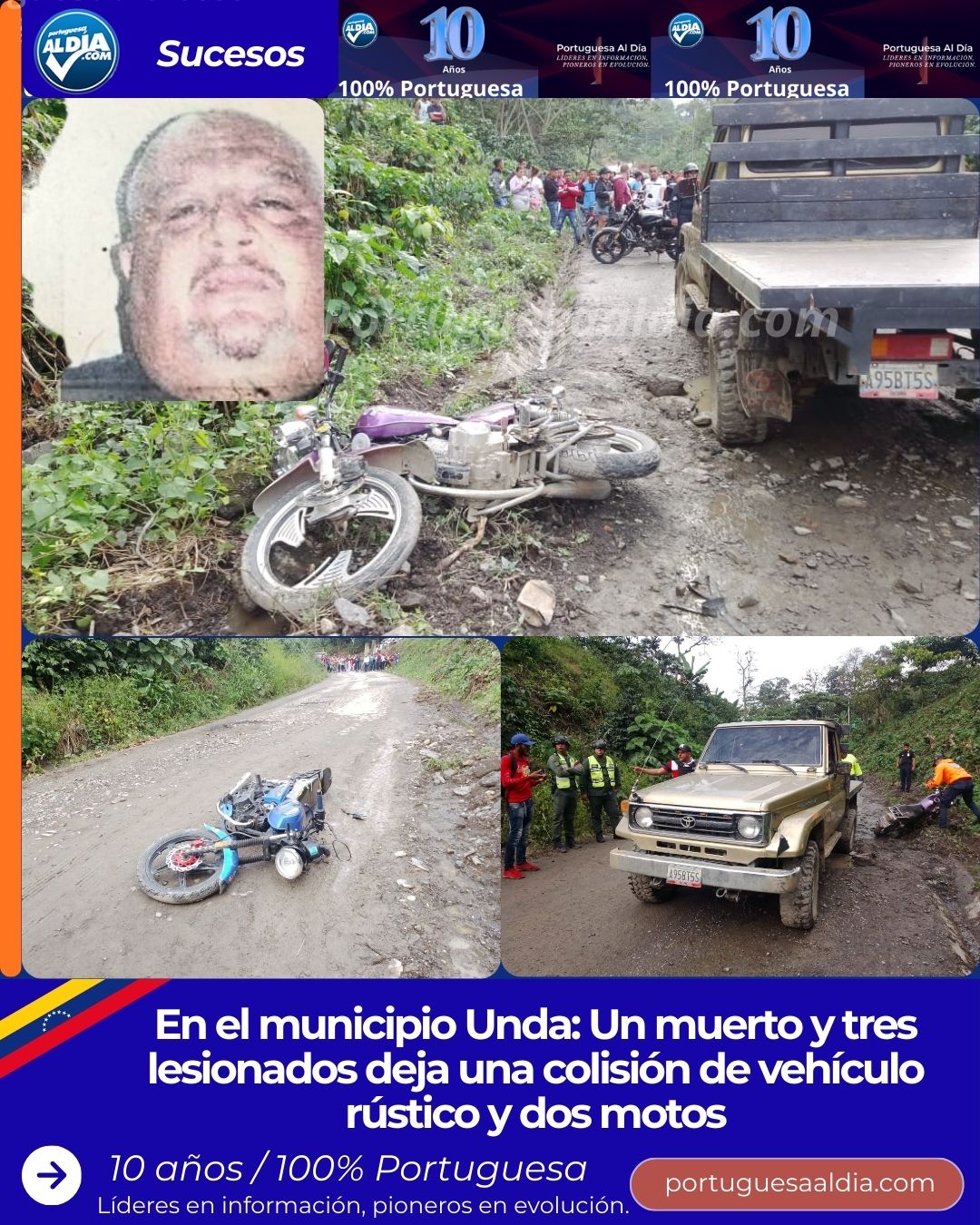 (Miguel Enrique Villavicencio).- Una persona fallecida y tres lesionados, entre ellos un niño de 4 años, dejó una colisión entre un vehículo rústico y dos motos, trágico hecho que se registró este domingo 15 de febrero en una carretera de penetración agrícola en la parte alta del caserío Palmarito II, jurisdicción del municipio Monseñor José Vicente de Unda.