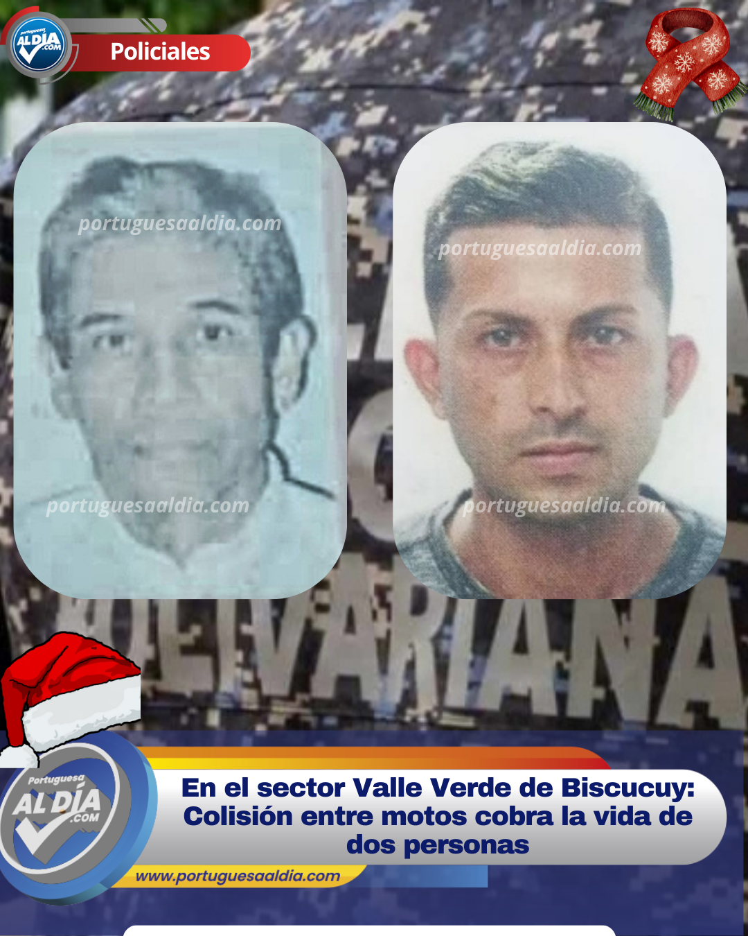 (Miguel Enrique Villavicencio).- Dos muertos fue el lamentable saldo que dejó una colisión entre motos, hecho que se registró este sábado 20 de diciembre en la carretera nacional Guanare – Boconó, a la altura del sector Valle Verde de la población de Biscucuy.
