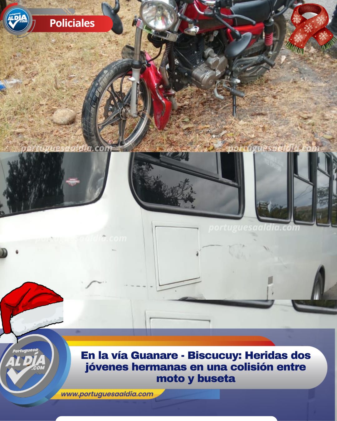 (Miguel Enrique Villavicencio).- Dos jóvenes hermanas resultaron lesionadas en una colisión entre moto y buseta, hecho que se registró este martes 30 de diciembre en la carretera nacional Guanare – Biscucuy, a la altura de Mesa de Cavacas, parroquia San Juan de Guanaguanare, jurisdicción del municipio capital.