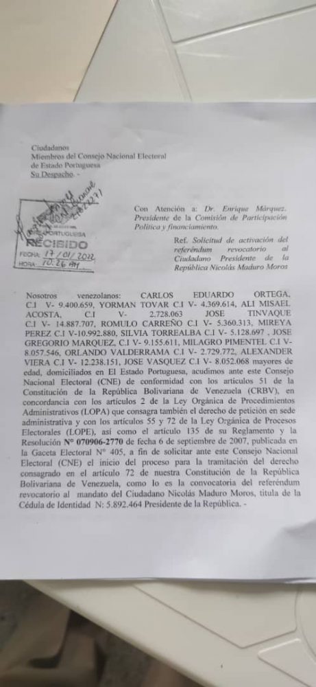 Un grupo de Portugueseños entregaron en el Consejo Nacional Electoral en la ciudad de Guanare, la solicitud de activación de Referéndum revocatorio contra el gobierno del presidente Nicolás Maduro Moros.