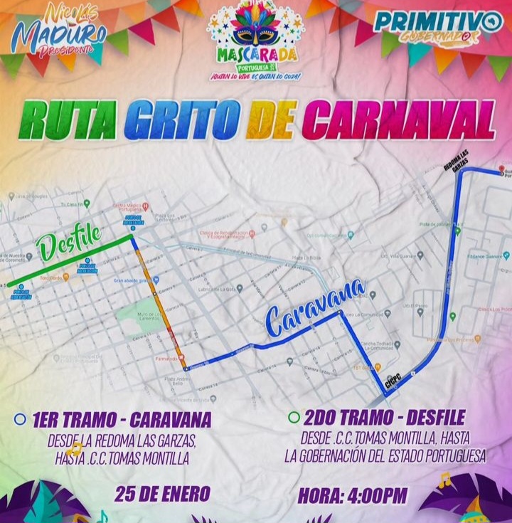 Se pudo conocer que el primer tramo corresponde a la caravana y será desde la Redoma Las Garzas hasta el Centro Cultural Tomás Montilla y el segundo tramo destinado para los desfiles, será desde el Centro Cultural hasta las afueras de la gobernación.