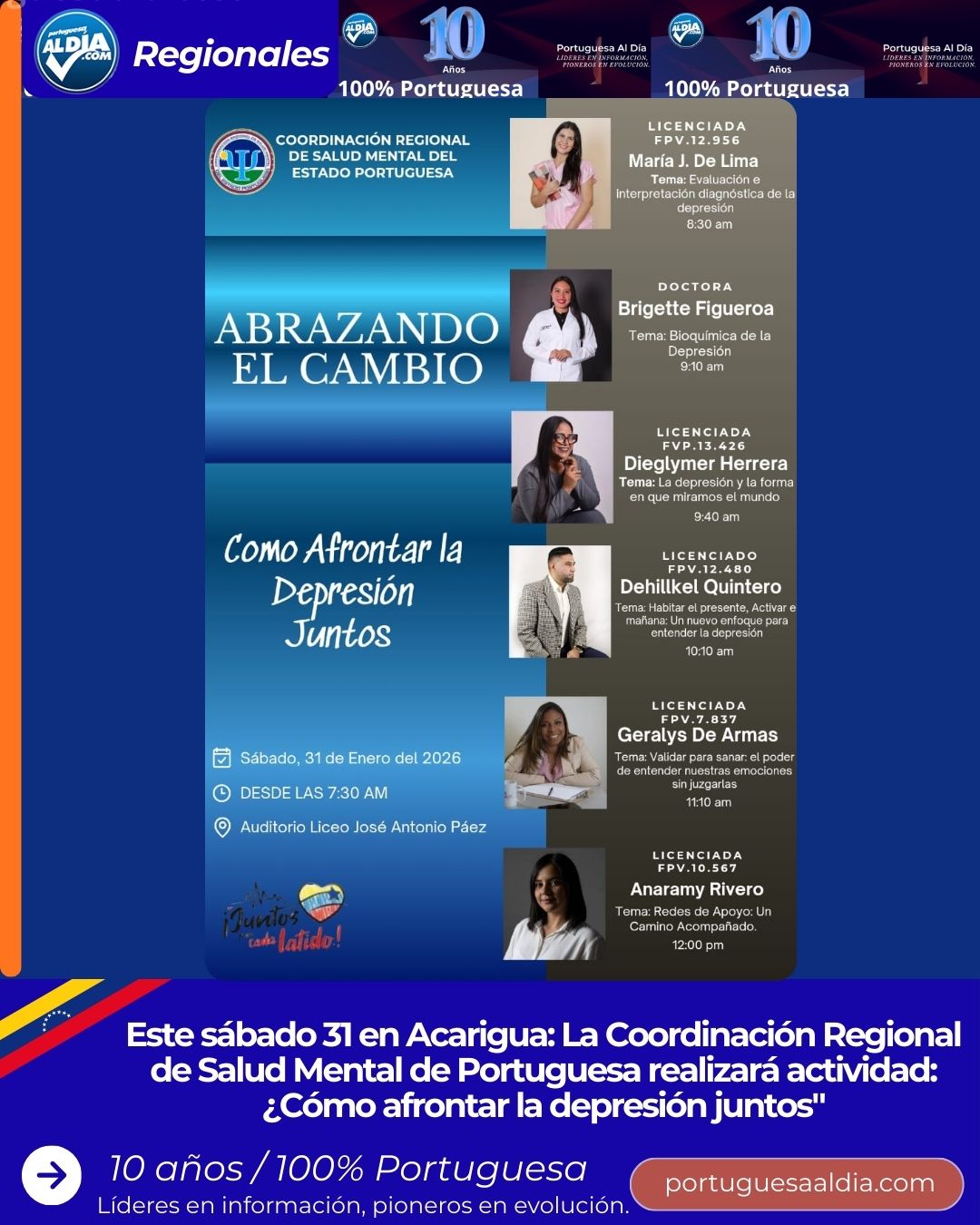 (Miguel Enrique Villavicencio).- Este sábado 31 de enero, en el auditorio del Liceo José Antonio Páez de Acarigua, la Coordinación Regional de Salud Mental del estado Portuguesa, tiene programada una actividad denominada «Abrazando el cambio, cómo afrontar la depresión juntos».