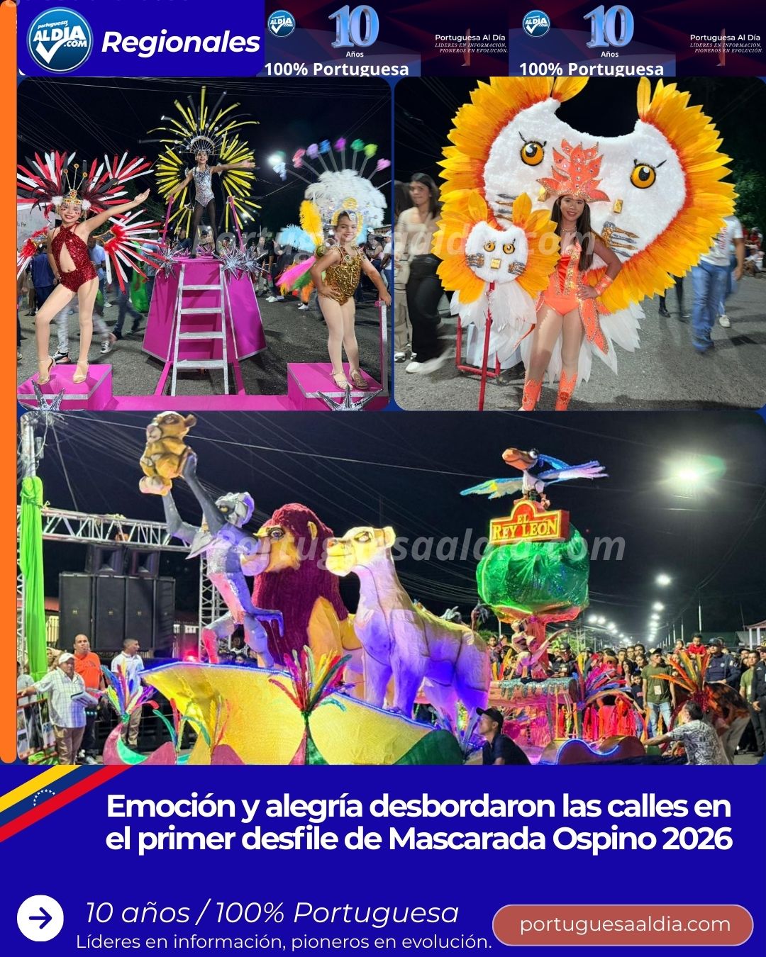 El municipio Ospino se vistió de gala para recibir el primer desfile de la Mascarada Ospino 2026, una jornada marcada por el colorido y la masiva participación ciudadana. El alcalde de la jurisdicción, Yongeiby Yépez, expresó su profunda satisfacción ante el desarrollo de esta actividad, la cual superó las expectativas en cuanto a asistencia de propios y visitantes. El burgomaestre indicó que el despliegue de comparsas y carrozas por las principales vías de la localidad es el resultado de un esfuerzo conjunto para rescatar las tradiciones llaneras durante el asueto.