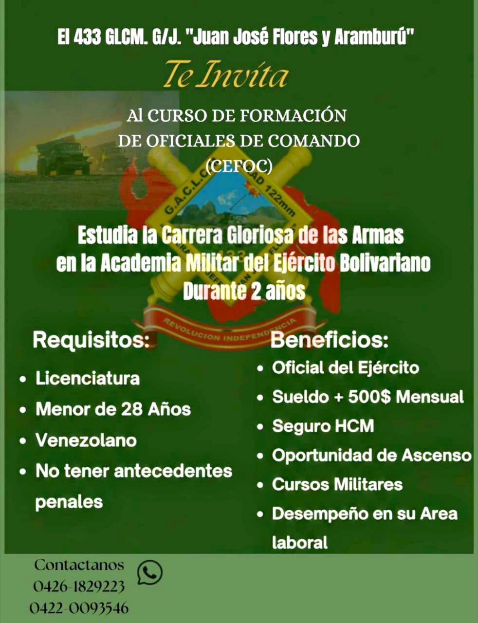 ACARIGUA, PORTUGUESA – El 433 GLCM G/J «Juan José Flores y Aramburú» hace un llamado oficial a los profesionales universitarios del país que sientan el llamado del servicio a la Patria, invitándoles a inscribirse en el Curso de Formación de Oficiales de Comando (CEFOC).