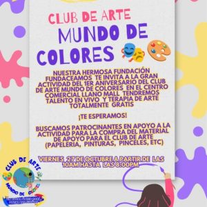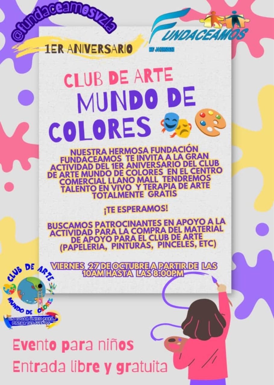 El club de Arte Mundo de Colores de Fundaceamos, celebrará su primer aniversario este viernes 27 de octubre desde las instalaciones del centro comercial Llano Mall, así lo dio conocer la presidente de esta fundación, Damaris Meléndez de Colmenarez.