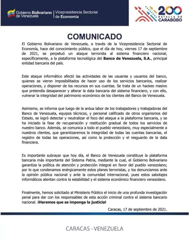 ▪️El Gobierno Bolivariano de Venezuela, a través de la Vicepresidencia Sectorial de Economía, hace del conocimiento público que el día de hoy, viernes 17 de septiembre de 2021, se perpetuó un ataque terrorista al sistema financiero nacional, específicamente, a la plataforma tecnológica del Banco de Venezuela, S.A., principal entidad bancaria del país, reza un comunicado oficial emitido hace minutos.