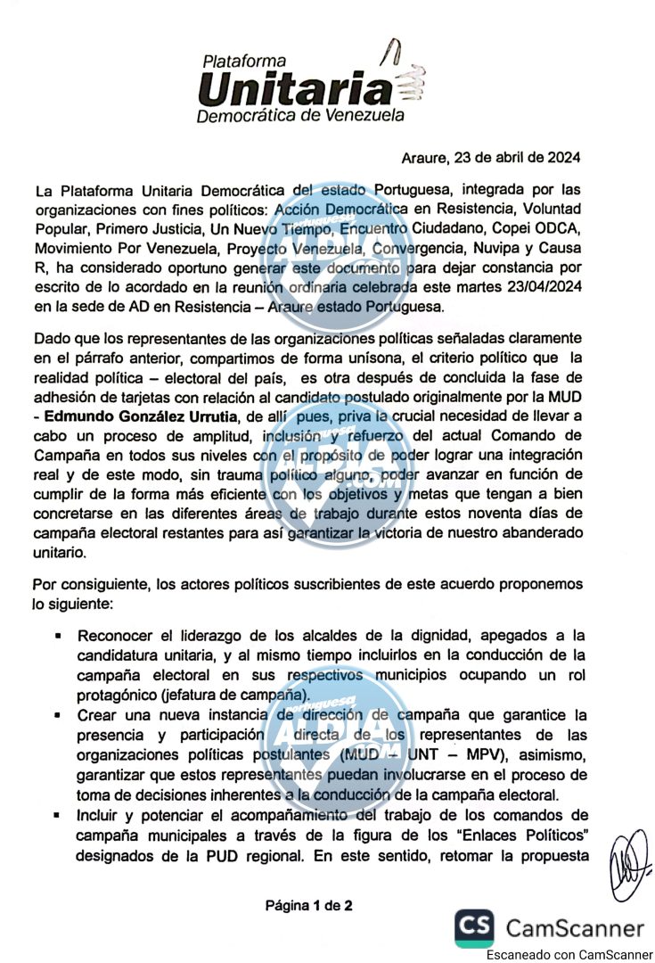 Los jefes de los partidos políticos en Portuguesa; que apoyan a Edmundo González, candidato de María Corina Machado a la presidencia de la república, se reunieron en Guanare el día jueves en la noche, donde le entregaron un documento en contra del comando de campaña de María Corina, que se ha convertido en régimen dictatorial, cosa que no le gusta a los dirigente de la PUD en la entidad, sobre todo a los alcaldes de oposición.
