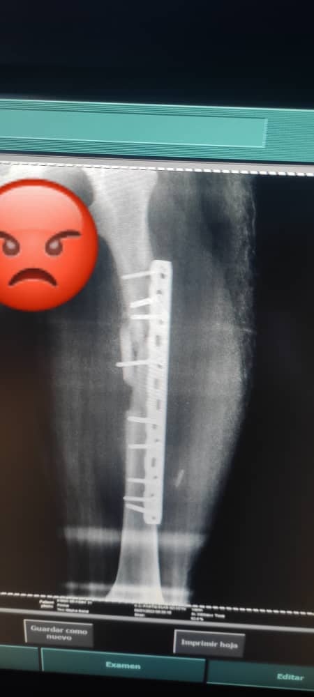 Cuenta el agraviado que durante el proceso de recuperación, “presenté molestias, al tiempo me tuve que volver a operar porque el Dr. hizo mal su trabajo ya que me dejó el hueso fuera de su lugar, tuve perdida ósea y la platina quirúrgica no es nueva, es usada y además presenta las siglas del MPPS; para mí, esto es un robo a la nación ya que yo pagué por una platina nueva, en una clínica privada, además no me colocó la platina adecuada a mí fractura, los tornillos no son los diámetros y están cortados con alicate, necesito que la fiscalía se aboque al caso ya que no me dan respuesta alguna sobre esto”.