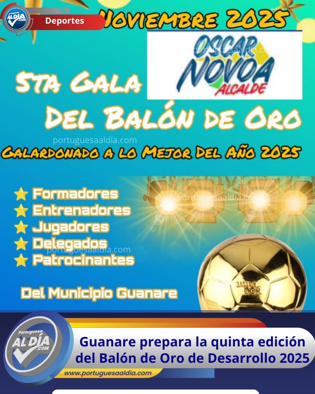 Guanare se alista para celebrar la quinta edición del Balón de Oro de Desarrollo, un evento que busca reconocer el esfuerzo y la dedicación de los atletas, formadores, clubes y dirigentes más destacados del año 2025 que forman parte de la liga de desarrollo de la localidad. La organización del evento está a cargo de la Dirección Técnica de Desarrollo, con el respaldo institucional del alcalde Oscar Novoa.