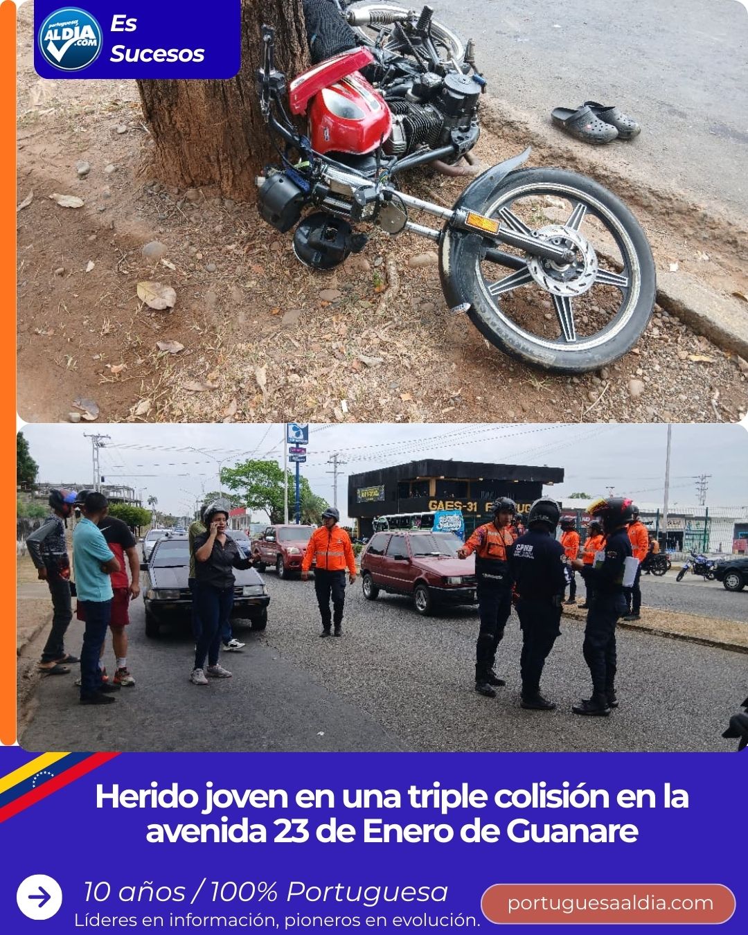 (Miguel Enrique Villavicencio).- Un joven resultó herido en una triple colisión que se registró la mañana de este martes 13 de enero en la avenida 23 de Enero de Guanare, a la altura del CC Ciudad Traki.