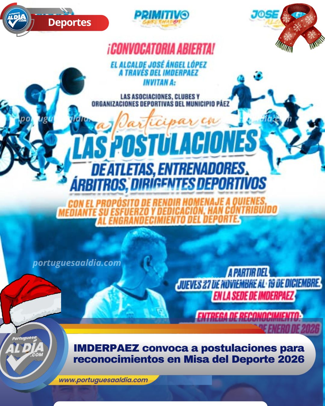 El alcalde José Ángel López, a través del Instituto Municipal del Deporte y la Recreación del Municipio Páez (IMDERPAEZ), ha emitido una convocatoria a todas las Asociaciones Deportivas del estado Portuguesa, Clubes y demás organizaciones sociales promotoras del deporte en el municipio. La invitación consiste en presentar las postulaciones de aquellos atletas, entrenadores, árbitros y dirigentes deportivos que se hayan distinguido notablemente en el ámbito internacional, nacional, regional o municipal. Esta iniciativa busca reconocer el esfuerzo y la dedicación de quienes han contribuido al engrandecimiento del deporte y la recreación en la jurisdicción.