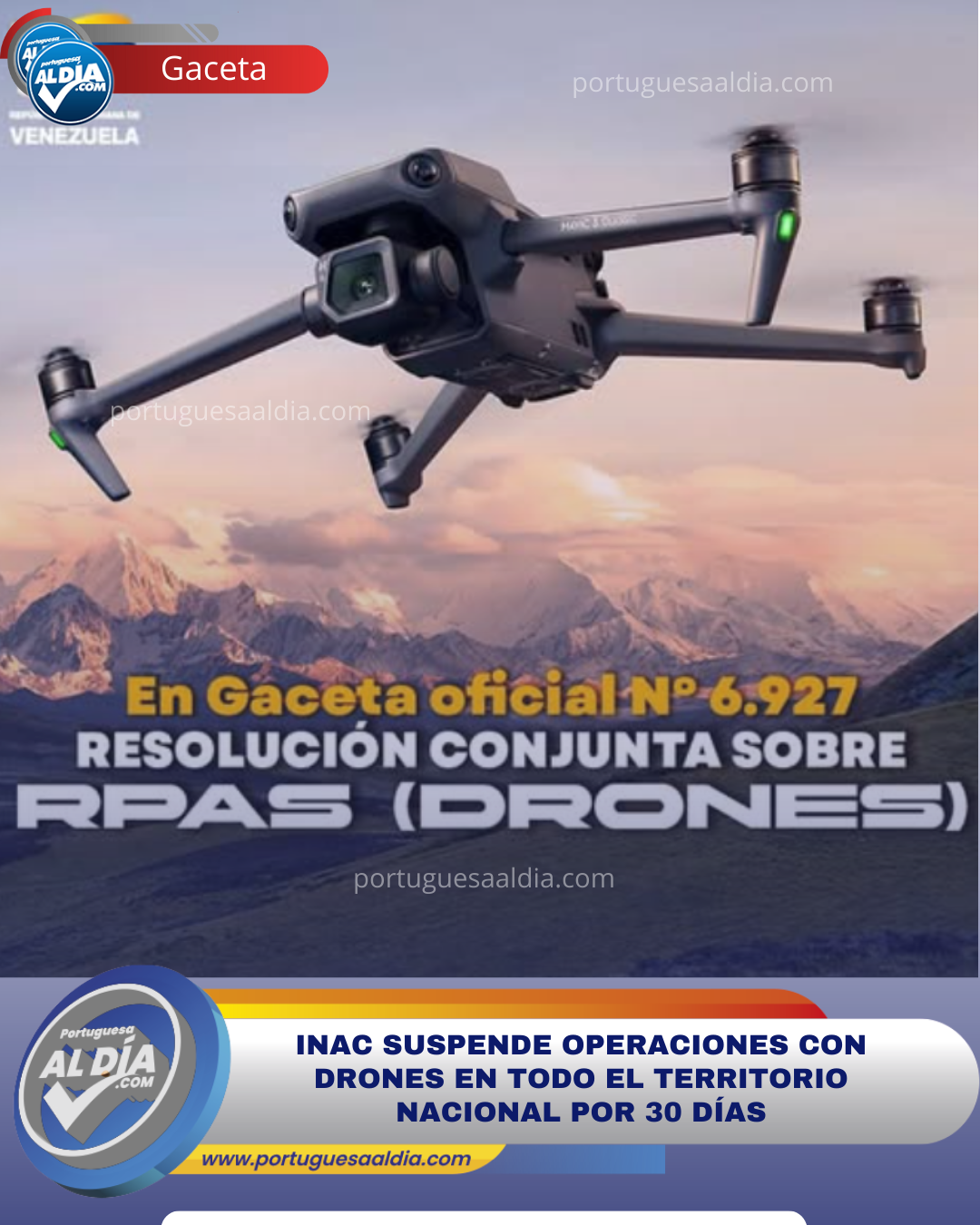 El Instituto Nacional de Aeronáutica Civil (INAC), en conjunto con el Ministerio del Poder Popular para el Transporte, informa a la opinión pública nacional e internacional la suspensión temporal por 30 días calendario de todas las operaciones con Aeronaves Pilotadas a Distancia (RPA), comúnmente conocidas como drones, y aeromodelos en el espacio aéreo venezolano.