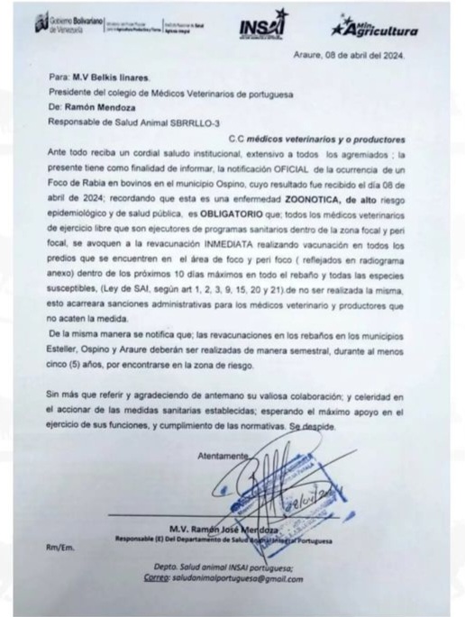 El Instituto Nacional de Salud Agrícola Integral, Insai, dio a conocer a través de un comunicado que en el municipio Ospino, fue encontrado un foco de rabia en bovinos, siendo esta una enfermedad zoológica de alto riesgo para la salud pública.