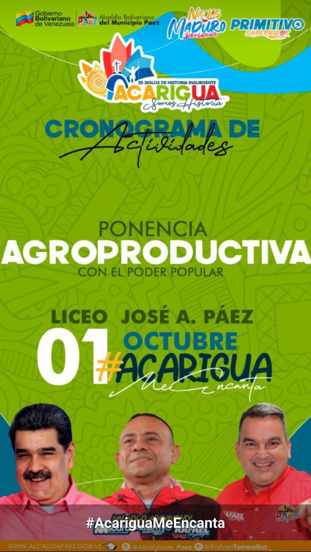 “Y eso está debidamente documentado y referenciado por los historiadores, que han hecho trabajos sobre este tema, ¿Cuál es nuestra intención con nuestra campaña de 25 siglos de historia insurgente?, bueno identificar que estamos claramente en un Franco y directo proceso de descolonización, eso significa que nosotros no somos pueblo, desde que los españoles se les ocurrió, o a los alemanes, o a los portugueses, por el contrario existimos desde hace muchísimo, pero muchísimos años más y está debidamente documentado y probado, precisamente el 29 de Septiembre nuestros profesores Luisa Velázquez y Juan Alonso, que son responsables del sistema de formación “Tatiana Delgado Niño”, de nuestra alcaldía del municipio van a dar una exposición, van a ser además de la exposición una charla y van a disertar sobre este tema histórico de nuestro pueblo de Acarigua y además, vamos a tener incluso una exposición de elementos, de evidencia física, que se han conseguido de que aquí, había pueblo, aquí había gente desde hace muchísimos años más, por eso celebramos esos 402 años el 29 de septiembre pero, al mismo tiempo nos afianzamos en reconocer que este pueblo ya estaba aquí y, vamos a continuar generando las condiciones para que nuestra gente sepa, se entere, y se documente, de que estamos completamente convencidos de que tenemos que deslastrarnos y desentenderse definitivamente de los tiempos de la colonia.