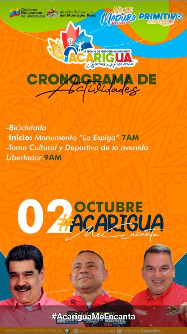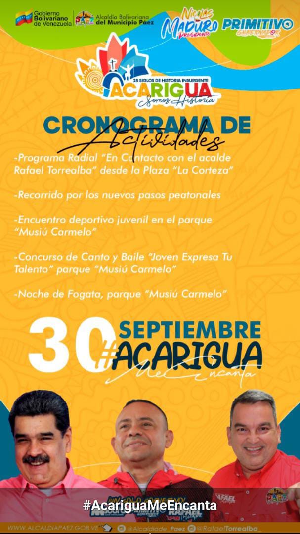 El jueves 29 -a las 9 am- está pautada la entrega de la Iglesia San Miguel Arcángel, donde se efectuará la Santa Misa en honor al patrono de la ciudad; y también está prevista la reinauguración de la Plaza Bolívar. Este día se desarrollará, además, la ponencia “Acarigua Historia Insurgente”, una Sesión Solemne a partir de las 5pm, donde el orador de orden será el presbítero Manuel Brito, un hijo insigne de Acarigua, que fue Vicario, responsable del santuario nacional Nuestra Señora de Coromoto, y definimos con el Concejo Municipal; que él fuese el orador de orden, mientras que su presentador será el Dr. Emilio Urbina, allí contaremos con la presencia del gobernador del estado Antonio Primitivo Cedeño, donde habrán anuncios bien importantes para el pueblo, en materia de gestión y de servicios público. Luego haremos el encendido de las luces de la Iglesia y las del Parque Musiú Carmelo. El viernes 30, la programación continúa a las 8am desde la Plaza La Corteza con la transmisión del programa “En Contacto con el alcalde Rafael Torrealba”, seguido de un recorrido por los nuevos pasos peatonales. Más tarde, ese mismo día, en el “Musiú Carmelo” se desarrollarán actividades deportivas, culturales y recreativas, así como la final del concurso “Joven Expresa tu Talento” y una fogata. Para el fin de semana está previsto, que el día sábado se celebre un encuentro con el Poder Popular en el liceo José Antonio Páez (9am), y el domingo (7am), una Bicicletada desde la redoma de La Espiga hasta la Plaza Bolívar, además de la toma cultural y deportiva de la avenida Libertador.