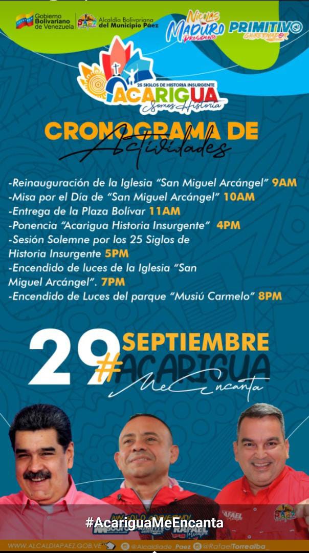 No son 402 años, 402 años son una referencia; y vamos a abrir un debate sobre este tema. Pero es un pueblo que está aquí, que estuvo aquí, desde hace más de 2500 años; debidamente documentado, por eso (…), en el marco de eso, nosotros preparamos una programación bien interesante que arranca el 29 de Septiembre a las 8:00 h de la mañana, vamos a estar en la iglesia de San Miguel Arcángel, que está aquí al frente de la Plaza Bolívar; haciendo entrega de esas instalaciones, que son una referencia de arquitectura de nuestro pueblo, y además es un patrimonio de nuestro municipio, ese templo de San Miguel Arcángel, que por cierto para los católicos y para nosotros los acarigueños y acarigueñas, es nuestro patrón San Miguel Arcángel y hemos hecho una inversión bien importante, para recuperar físicamente, por dentro y por fuera, esa iglesia, ese templo y este jueves 29 a las 8:00 h de la mañana empezamos con esa actividad, entregando allí esas instalaciones, haciendo un recorrido con los sacerdotes, vamos a tener una celebración eucarística que va a ser consagrada, es decir; casi todos los párrocos van a venir a oficiar la misa, la Santa Misa que para nosotros los católicos es muy importante. Igual nosotros estamos invitando a todo el pueblo, porque la verdad es que la infraestructura y la obra que se hizo ahí, es algo digno de ser apreciado, por toda nuestra gente.