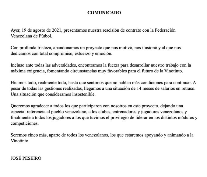 La Vino Tinto sin Director Técnico, un Año sin Cobrar Tenía José Peseiro, el Ministerio del Deporte nunca Bajó los Recursos, según se conoció.