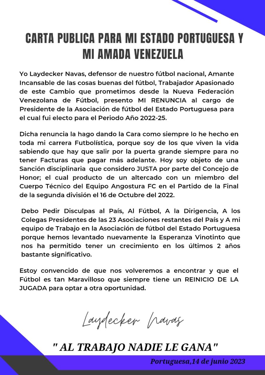 El reconocido futbolista Laydecker Navas, renunció a su cargo como Presidente de la Asociación de Fútbol del estado Portuguesa, para la cual fue electo hasta 2025.⁣
