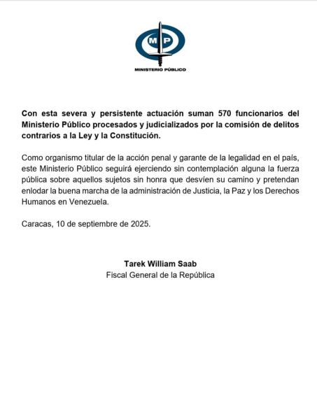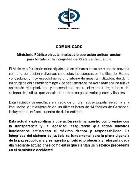 PortuguesaAldia.com – El Ministerio Público de Venezuela, liderado por el fiscal general Tarek William Saab, ejecutó desde la madrugada del 7 de septiembre una «implacable operación anticorrupción» dirigida a «elementos degradados» del sistema de justicia, incluyendo jueces, fiscales y otros funcionarios.