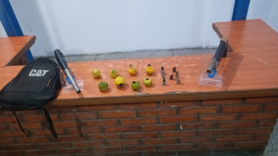 Entre ellos Objetos tipo facsímil uno a cada uno en la pretina del pantalón, elaborados con madera y metal, así mismo un bolso de color negro tipo escolar dentro del cual se observan, fijan e incautan ocho (08) objetos punzo penetrantes elaborados en metal con corte cilíndrico en uno de sus extremos, de los ocho, tres incrustados en naranjas.